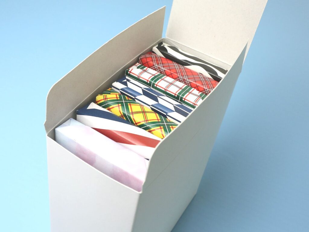 板チョコ、クッキーなどのお菓子から、ステッカーやパンフレットなどの紙製品といった、自立が難しい商品を想定したパッケージとしていかがでしょうか。