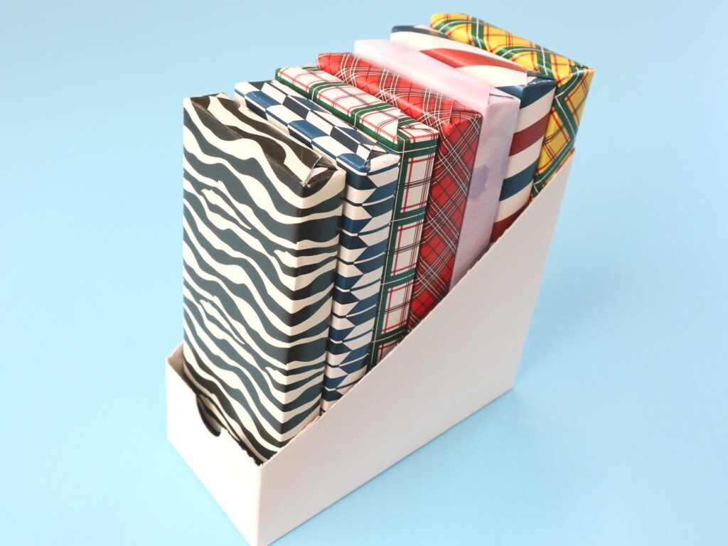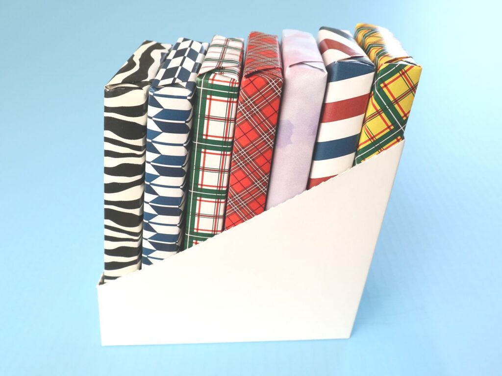 こちらのケースであれば、箱自体に傾斜が付いている構造であるため、自然と商品が後ろ側に傾くかたちになり、薄く平たい形状の商品でも前方に倒れてくることなく安定した状態で陳列できます。